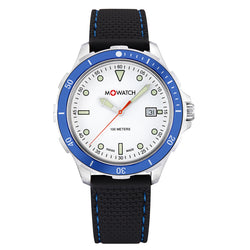 Robust & sporty. This masculine watch features a black strap and a 42 mm brushed stainless steel case. The white dial is accentuated by bold luminous hands and markers, ensuring visibility in dark light conditions. The blue uni-directional rotating bezel frames the dial adding a touch of colour and marks a 24-hour scale for added functionality. A date window at the 3 o'clock position adds a further practical detail, while the screwed case back and 100-meter water resistance ensure durability and performance also under water. Powered by a precise quartz movement, this Swiss Made watch offers reliable and accurate timekeeping and is perfect for both casual and more elegant occasions.
