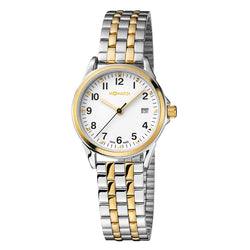 Zeitlos schön. Die Uhr verfügt über ein luxuriöses, zweifarbiges Gliederarmband mit Schiebeschliesse, das Silber- und Goldtöne kombiniert und so einen klassisch-eleganten Look kreiert. Das IP-vergoldete 28 mm Gehäuse unterstreicht das Design des Armbands und verleiht einen Hauch von Raffinesse. Die kräftigen arabischen Ziffern auf dem weissen Zifferblatt sorgen für gute Ablesbarkeit. Dieser Swiss Made Zeitmesser mit seinem zuverlässigen Quarzwerk ist mehr als nur ein Accessoire, er ist ein Statement für dauerhaften Stil.