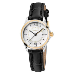 Sorgfältig gefertigtes zeitloses Design. Diese elegante Uhr verfügt über ein raffiniertes schwarzes Lederarmband, kombiniert mit einem 28 mm IP-vergoldeten Gehäuse. Das weisse Zifferblatt ist mit schwarzen römischen Ziffern verziert, die einen Hauch von klassischem Charme und Präzision verleihen. Ausgestattet mit einem Quarzwerk und handgefertigt in unserer Fabrik garantiert diese Swiss Made Uhr präzise Zeitmessung mit jedem Ticken. Ein perfekter Begleiter für alle, die eine Kombination aus Eleganz und Handwerkskunst zu schätzen wissen.