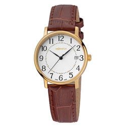 Das 35 mm IP-vergoldete Gehäuse dieser exquisiten Uhr wird von einem luxuriösen, braunen Lederarmband mit strukturiertem Krokodilmuster umfasst. Das weisse Zifferblatt ist mit eleganten arabischen Ziffern versehen, die einen Hauch von Vintage mit moderner Präzision verbinden. Goldfarbene Akzente unterstreichen die raffinierte Ausstrahlung der Uhr, während das Swiss Made Quarzwerk für eine genaue und zuverlässige Zeitmessung sorgt.