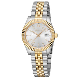Zeitlose Eleganz. In diesem klassischen Design harmonieren die Silber- und Goldtöne perfekt miteinander. Das zierliche 36 mm Gehäuse ist IP-vergoldet und wird mit einem wunderschön gearbeiteten fünfgliedrigen Armband kombiniert. Das silberfarbene Zifferblatt, das durch gehärtetes Mineralglas geschützt wird, ist mit goldfarbenen Indexen und einer Datumsfunktion versehen. Diese Swiss Made Uhr ist mit einem Quarzwerk ausgestattet.