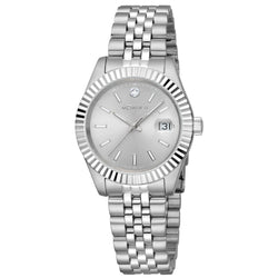 Zeitlose Eleganz. Dieses monochrome Design steht für einen klassischen Stil. Das zierliche 36mm Gehäuse aus Edelstahl wird mit einem wunderschön gearbeiteten fünfgliedrigen Armband kombiniert. Das silberfarbene Zifferblatt, das durch gehärtetes Mineralglas geschützt wird, ist mit silberfarbenen Indexen verziert und mit einer Datumsfunktion versehen. Diese Swiss Made Uhr ist mit einem Quarzwerk ausgestattet.