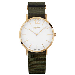 Diese sportlich-klassische Uhr kombiniert ein 40 mm IP vergoldetes Gehäuse mit einem khakigrünen Textilband. Das weisse Zifferblatt mit goldfarbenen Stundenmarkierungen, Zeigern und einer markanten 12, verleiht einen eleganten Look. Diese Swiss Made Uhr ist mit einem zuverlässigen Quarzwerk ausgestattet und eignet sich perfekt für den Alltag als auch für besondere Gelegenheiten.