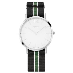 Diese sportlich-klassische Uhr kombiniert ein 40 mm poliertes Edelstahlgehäuse mit einem schwarzen Textilband mit grünen und weissen Streifen. Das monochrome silberfarbene Zifferblatt mit silberfarbenen Indexen und einer markanten 12, verleiht einen eleganten, minimalistischen Look. Diese Swiss Made Uhr ist mit einem zuverlässigen Quarzwerk ausgestattet und eignet sich perfekt für den Alltag als auch für besondere Gelegenheiten.