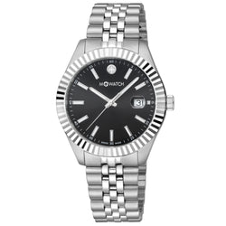 Zeitlose Eleganz. Dieses exquisite Design steht für einen klassischen Stil. Das 41 mm Gehäuse aus Edelstahl wird mit einem wunderschön gearbeiteten fünfgliedrigen Armband kombiniert. Das schwarze Zifferblatt, das durch gehärtetes Mineralglas geschützt wird, ist mit silberfarbenen Indexen verziert und mit einer Datumsfunktion versehen. Diese Swiss Made Uhr ist mit einem Quarzwerk ausgestattet.