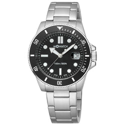 Robust und sportlich. In dieser maskulinen Uhr geht das 41 mm Edelstahlgehäuse scheinbar nahtlos in das silberfarbene Gliederarmband über. Auf dem schwarzen Zifferblatt sind markante, leuchtende Zeiger und Ziffern zu sehen, die die Ablesbarkeit in allen Lichtverhältnissen gewährleisten. Die schwarze, unidirektionale Drehlünette ist mit einer 24-Stunden-Skala versehen. Ein Datumsfenster auf der 3-Uhr-Position fügt ein weiteres praktisches Detail hinzu, während der verschraubte Gehäuseboden und die 100-Meter-Wasserdichtigkeit für Langlebigkeit und Leistung auch unter Wasser sorgen. Das präzise Quarzwerk dieser Swiss Made Uhr gewährleistet eine zuverlässige und genaue Zeitmessung.
