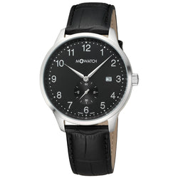 Zeitloser Klassiker. Diese elegante Uhr kombiniert ein poliertes 42 mm Edelstahlgehäuse mit einem schwarzen Lederarmband. Die silberfarbenen arabischen Ziffern und Zeiger kontrastieren mit dem schwarzen Zifferblatt und sorgen für eine klare Anzeige. Ein Hilfszifferblatt fügt einen Hauch von Komplexität und Funktionalität hinzu, während das Datumsfenster auf der 3-Uhr-Position eine weitere nützliche Funktion bietet. Diese Swiss Made Uhr garantiert eine präzise Zeitmessung und eignet sich sowohl für formelle Anlässe als auch für das tägliche Tragen.