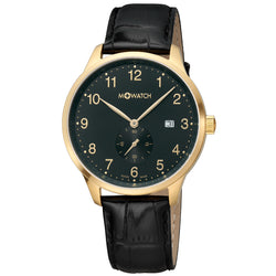 Zeitloser Klassiker. Diese elegante Uhr kombiniert ein IP vergoldetes Gehäuse mit einem schwarzen Lederarmband. Die goldfarbenen arabischen Ziffern und Zeiger kontrastieren mit dem schwarzen Zifferblatt und sorgen für eine klare Anzeige. Ein Hilfszifferblatt fügt einen Hauch von Komplexität und Funktionalität hinzu, während das Datumsfenster auf der 3-Uhr-Position eine weitere nützliche Funktion bietet. Diese Swiss Made Uhr garantiert eine präzise Zeitmessung und eignet sich sowohl für formelle Anlässe als auch für das tägliche Tragen.