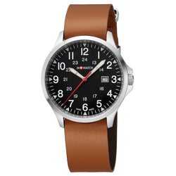 Markant und stilvoll. Diese klassische, maskuline Uhr kombiniert ein 44 mm Gehäuse aus brossiertem Edelstahl mit einem braunen Lederarmband. Die arabischen Ziffern und leuchtenden Zeiger auf dem schwarzen Zifferblatt sorgen für eine klare Ablesbarkeit bei jedem Licht. Der Sekundenzeiger ist durch seine auffällige, rote Farbe gut zu erkennen und das Datumsfenster auf der 3-Uhr-Position bietet ein weiteres, praktisches Detail. Diese Swiss Made Uhr ist mit einem zuverlässigen Quarzwerk ausgestattet und eignet sich perfekt für den Alltag als auch für besondere Gelegenheiten.
