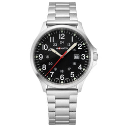 Markant und stilvoll. Diese klassische, maskuline Uhr kombiniert ein 44 mm Gehäuse aus brossiertem Edelstahl mit einem passenden Armband aus dem selben Material. Die arabischen Ziffern und leuchtenden Zeiger auf dem schwarzen Zifferblatt sorgen für eine klare Ablesbarkeit bei jedem Licht. Der Sekundenzeiger ist durch seine auffällige, rote Farbe gut zu erkennen und das Datumsfenster auf der 3-Uhr-Position bietet ein weiteres, praktisches Detail. Diese Swiss Made Uhr ist mit einem zuverlässigen Quarzwerk ausgestattet und eignet sich perfekt für den Alltag als auch für besondere Gelegenheiten.